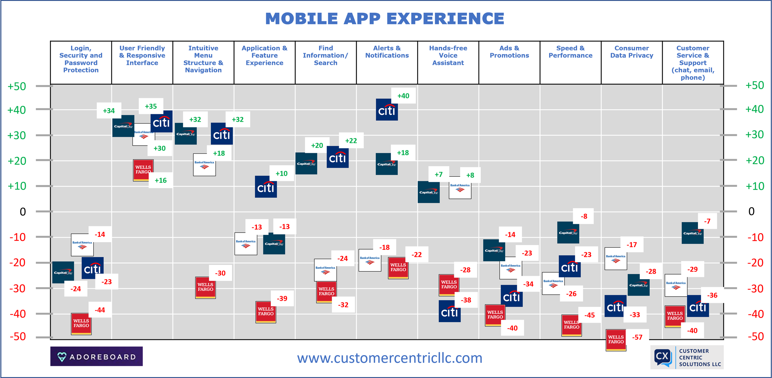 Poor (-15 to -35): Consumer Data Privacy [-17]; Alerts & Notifications [-18]; Ads & Promotions [-23]; Find Information/Search [-24]; Speed & Performance [-26]; and Customer Service & Support [-29].